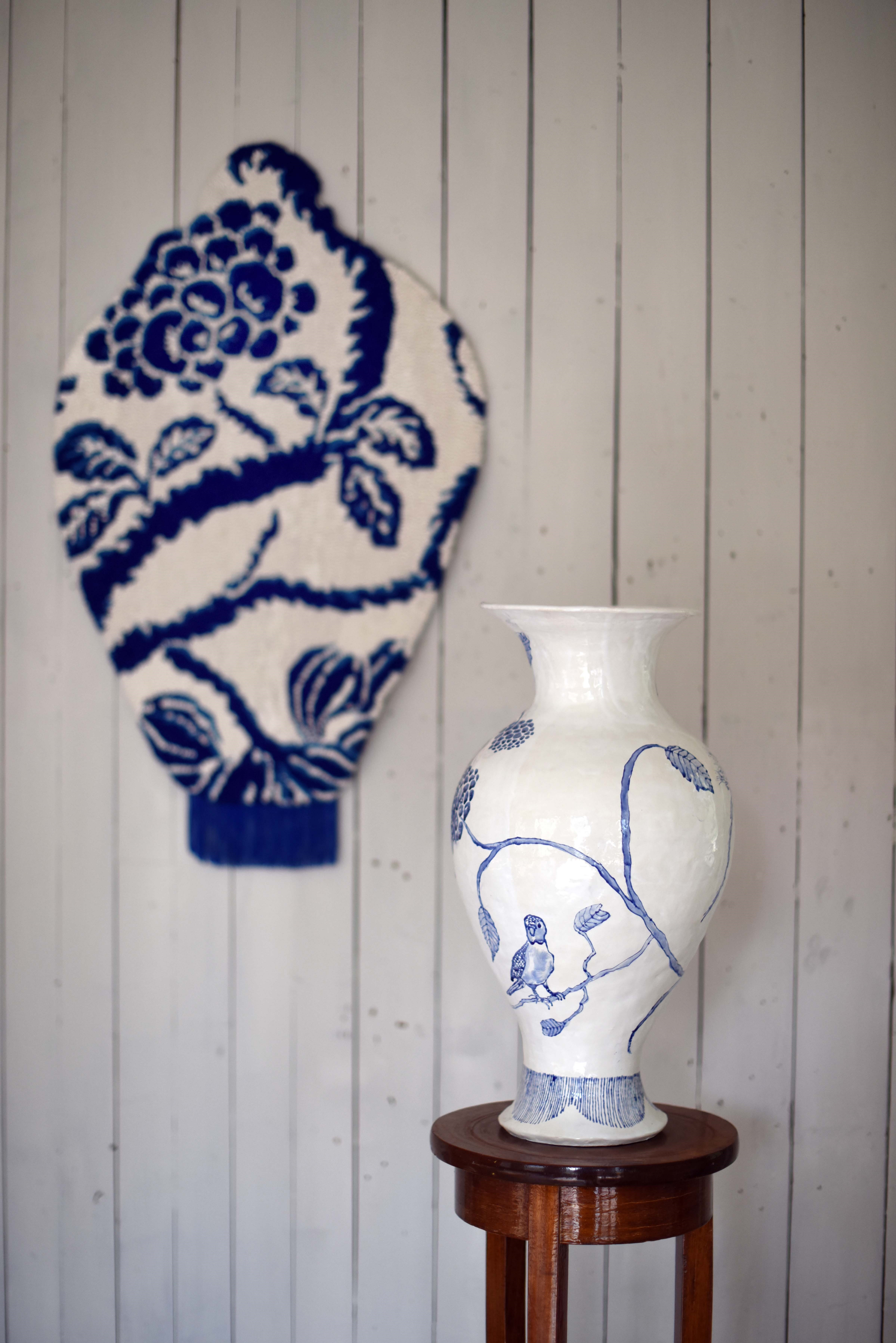 "Solvi og Lothe ble kjent med hverandres kunstnerskap via Instagram. Begge interesserer seg for de langsomme prosessene, for håndverket, bærekraft og tingenes fortellinger. Solvi arbeider med tekstil og Lothe med keramikk, ofte i dialog med funne gjenstander. Begge er opptatt av det nære; ting de har arvet, fått eller funnet og det tingene bærer med seg av assosiasjoner, minner, refleksjoner og betraktninger. Et samarbeid innebærer at man kan dra veksler på hverandre, og inspireres av hverandres likheter og ulikheter, av det myke tekstilet og den harde keramikken. Det blå-hvite, det klassiske, blomstene, dyrene og det viltre, rampete og anarkistiske."