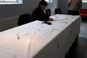 Broderi-performance i Litteraturhuset med kunstnaren Kwestan Jamal Bawan.